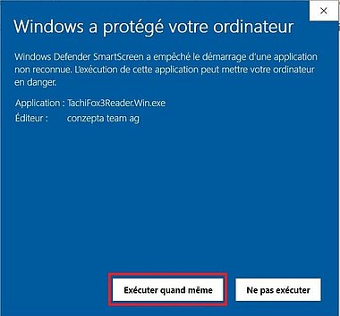- Vous voyez maintenant qu'il s'agit du TachiFox Reader et que celui-ci a été développé par Conzepta Team AG. Pour l'étape suivante, cliquez sur «Exécuter malgré tout».