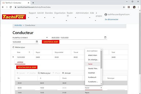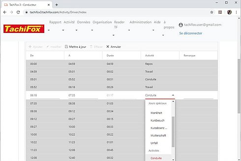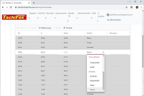 Le cas du moniteur de conduite : lorsque l’apprenti conducteur est au volant, le temps passé sur le siège du passager compte, pour l’instructeur qui l’accompagne, comme du temps de conduite. Cependant, les tachygraphes ne peuvent inscrire que du temps de disposition. Il vous suffit alors de changer ce temps de disposition en temps de conduite dans TachiFox Pro, afin que le rapport soit correct.
