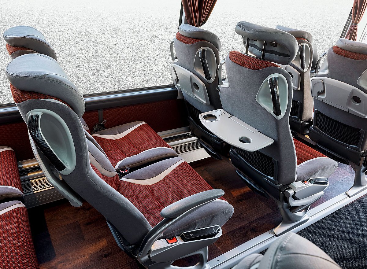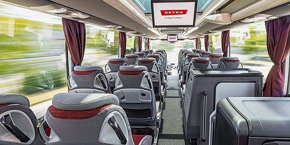 De manière générale, Setra n’a pas modifié l’apparence du véhicule depuis sa refonte en 2022. La version la plus récente n’est donc reconnaissable au premier coup d’œil que si le système de caméras rétroviseurs MirrorCam, disponible en option, est installé. Il s’agit pour ainsi dire du fer de lance des innovations techniques, qui comprennent notamment l’assistant de freinage d’urgence encore amélioré (Active Brake Assist 6), l’assistant de changement de direction (Sideguard Assist 2) et, en option, un système de caméras à 360° en complément de la caméra de recul. De nombreuses technologies, telles que l’interface Alcotester, l’alerte de vigilance et la reconnaissance des panneaux de signalisation, font partie des dernières réglementations européennes en matière d’équipement automobile.