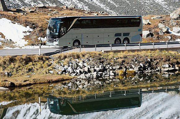 Nous sommes en route à bord d’un tout nouveau Setra S 516 HDH, afin de tester la nouvelle technologie dans des conditions d’utilisation aussi réelles que possible. Avec une longueur de 13,30 mètres, le S 516 se situe entre ses modèles frères S 515 (12,50 mètres) et S 517 (14,20 mètres) et il est considéré par Setra comme le juste milieu en termes d’espace et de maniabilité. Notre circuit démarre à Landquart, passe par le col de la Flüela pour rejoindre l’Engadine, puis revient à Landquart via le col du Julier, soit 220 kilomètres variés sous un ciel bleu azur qui nous offre le privilège de passer la mi-journée au soleil à Bever malgré les températures basses.
